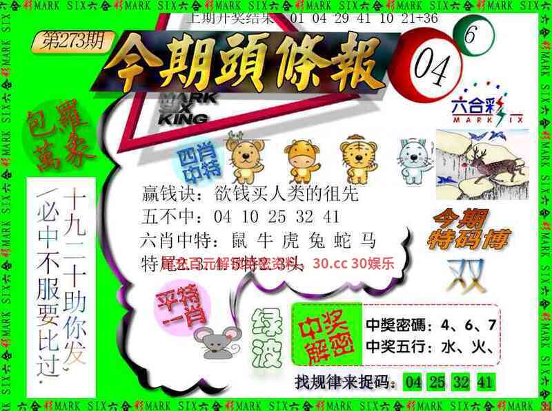273期:稳赚七肖【狗龙鼠鸡马虎蛇】开:虎04对 |